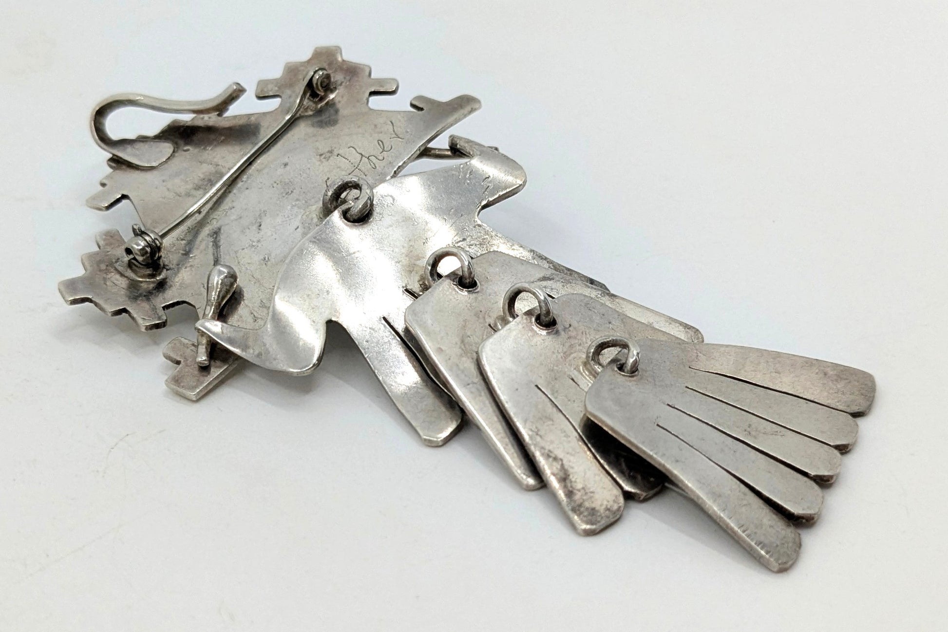 Incredible, one-of-a-kind and articulated Shalako pendant/brooch by Dine (Navajo) artist Esther Wood. This wonderful pieces is made of sterling silver and set with a blue turquoise stone as its face.