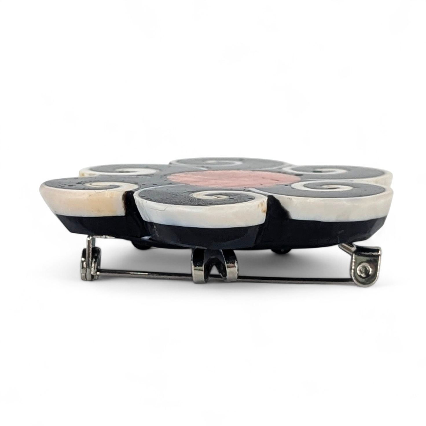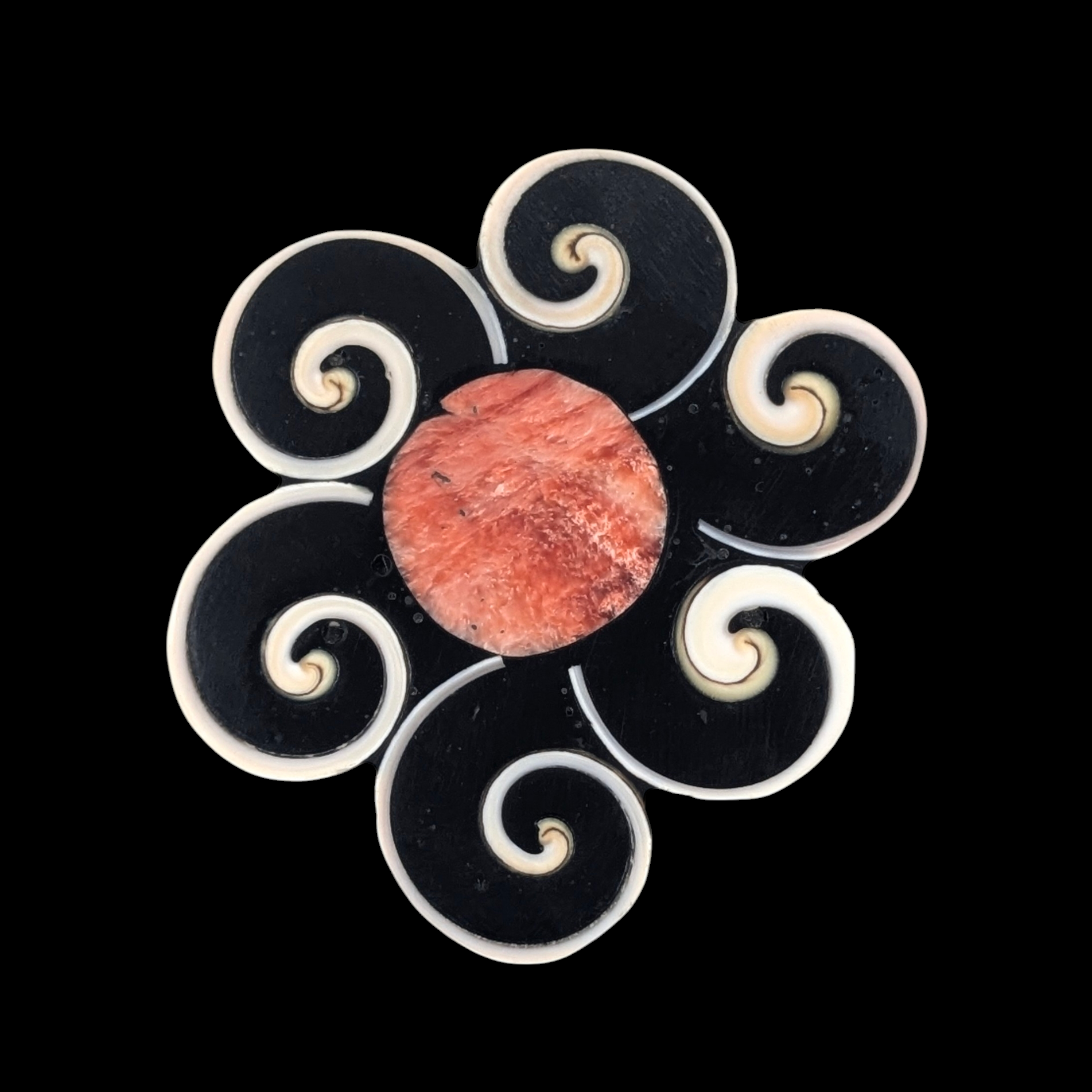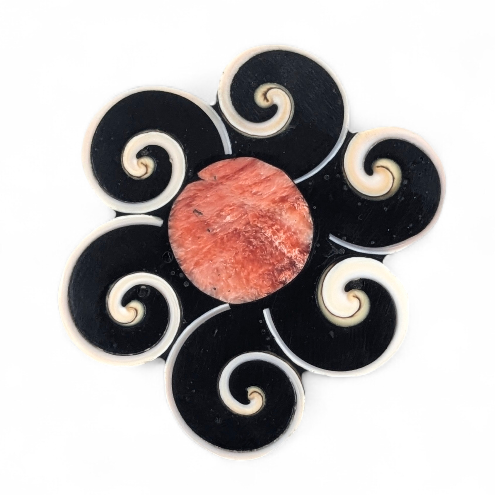 Lovely flower convertible pendant/brooch by Santo Domingo (Kewa) artist Mary Louise Tafoya. It is made of shell and jet epoxy with an orange spiny oyster center.