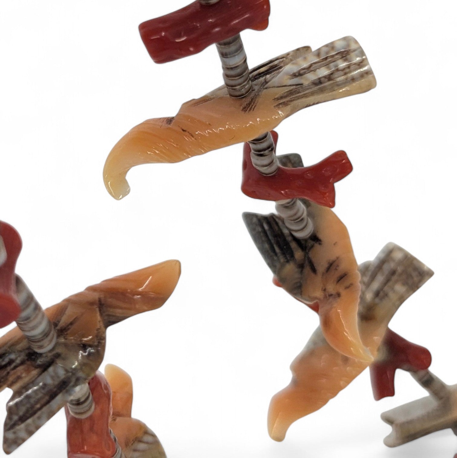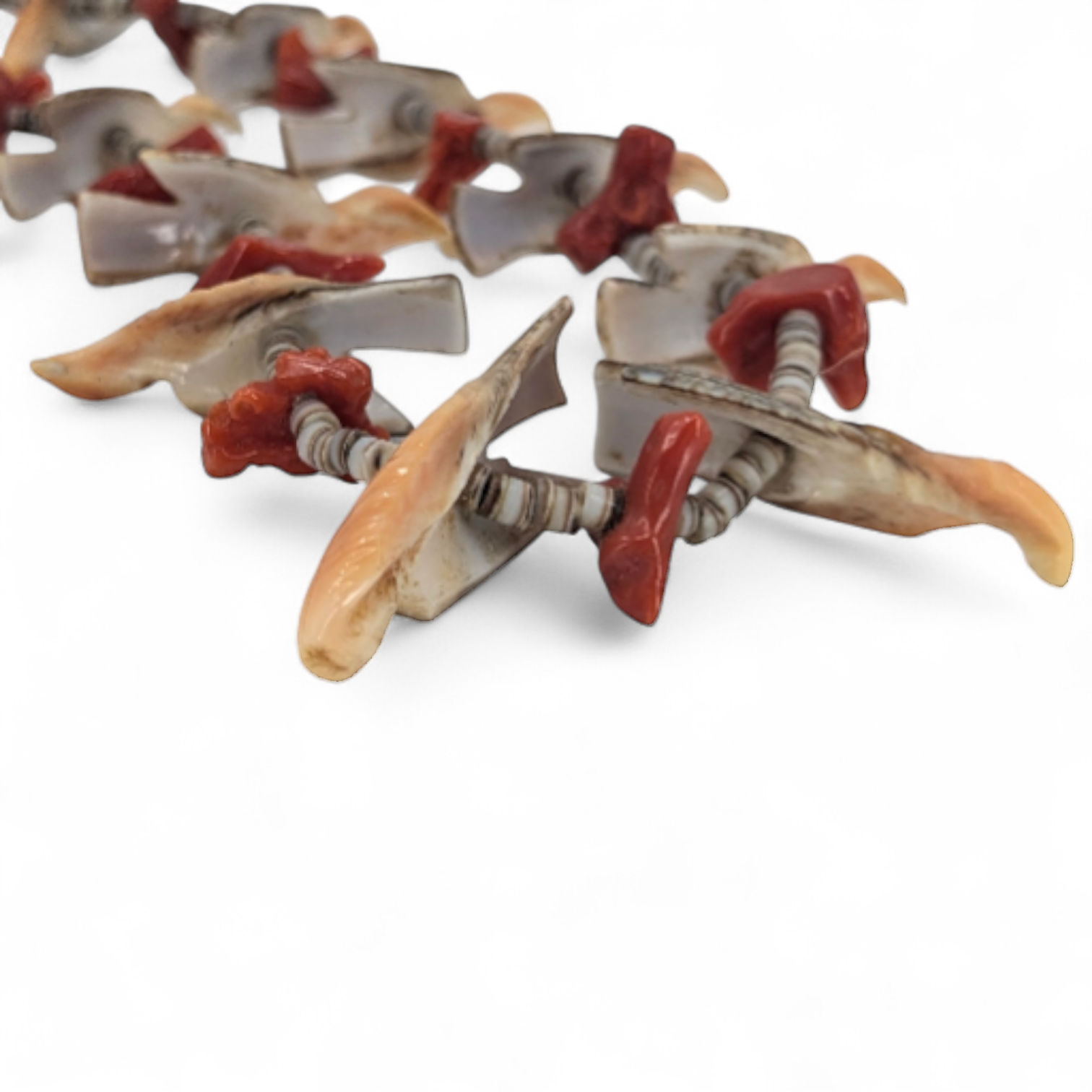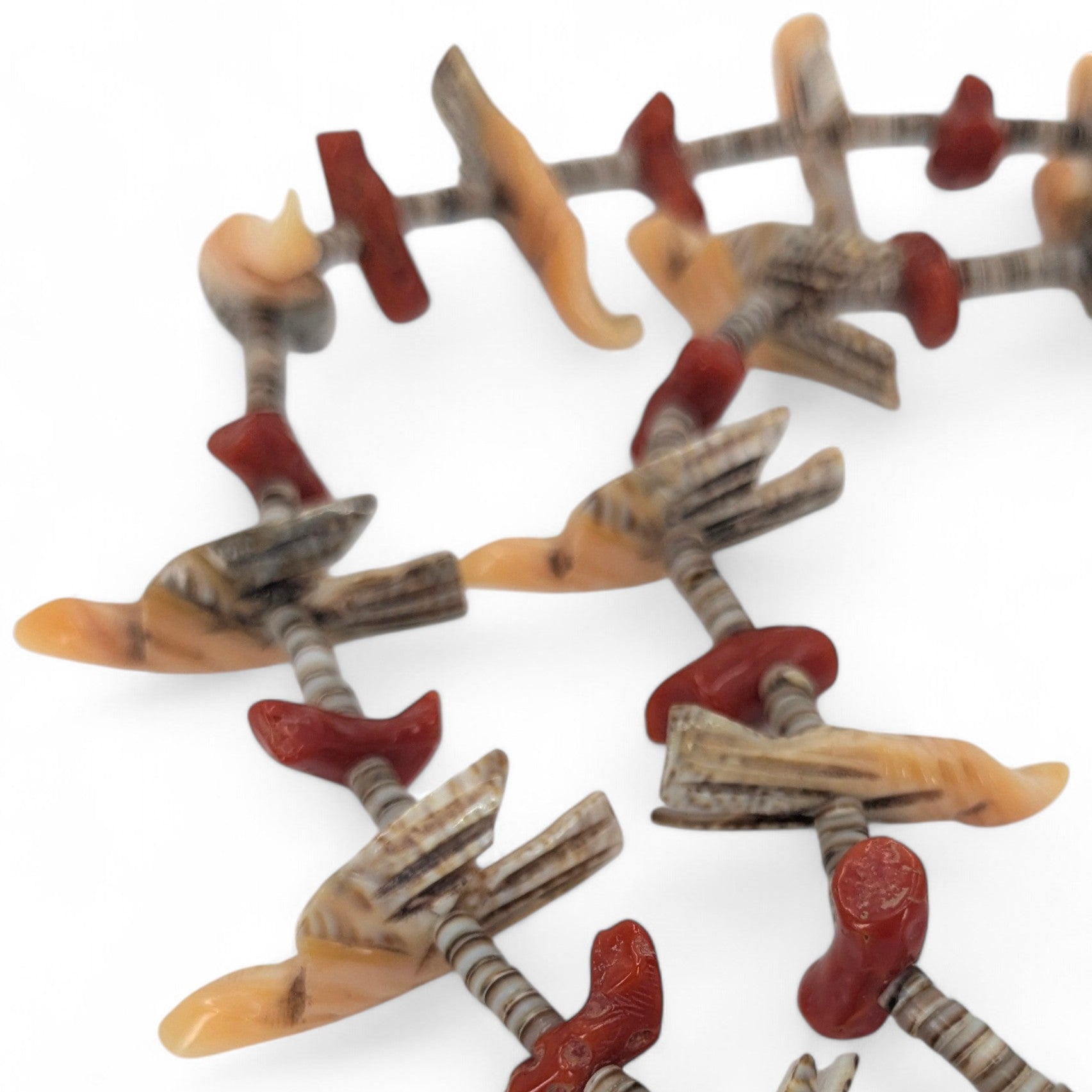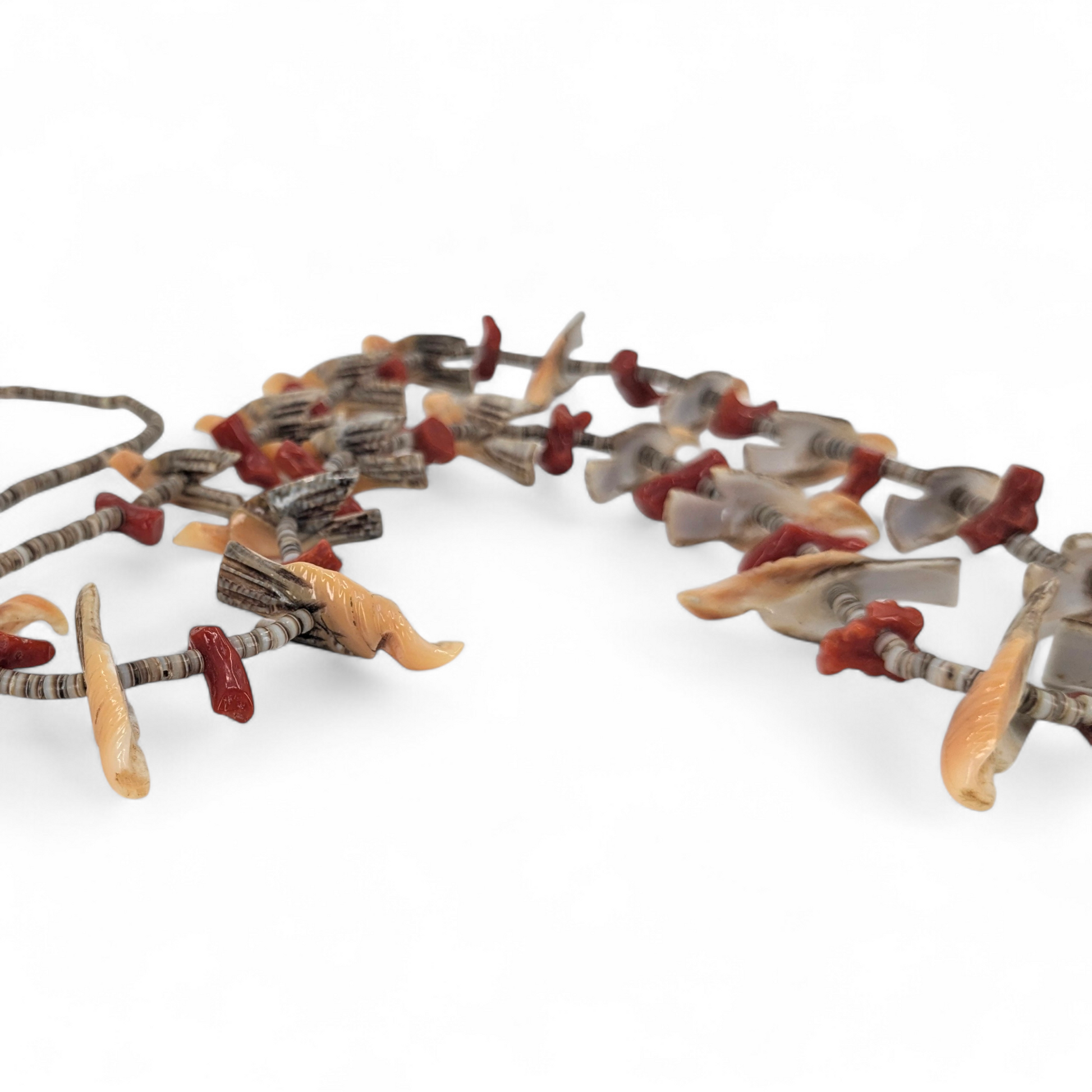 Vintage (c. 1980s-1990s) Santo Domingo (Kewa) heishi necklace with bird fetishes and coral. Possibly by the Garcia family.