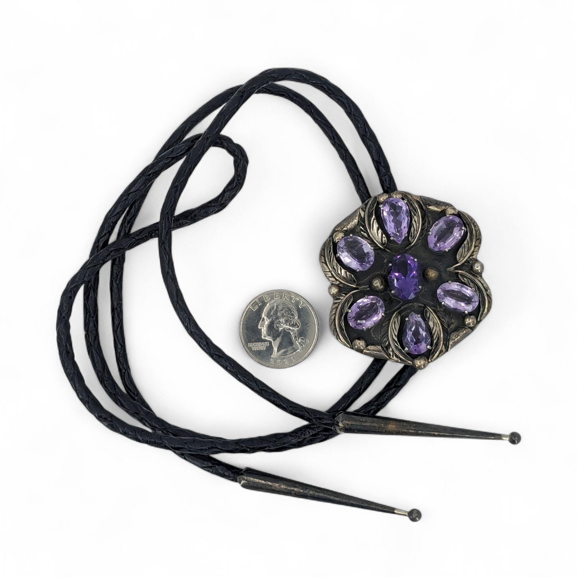 Vintage sterling silver bolo with seven stunning amethyst gemstones framed by leaf details. Leather bolo cord with sterling tips.